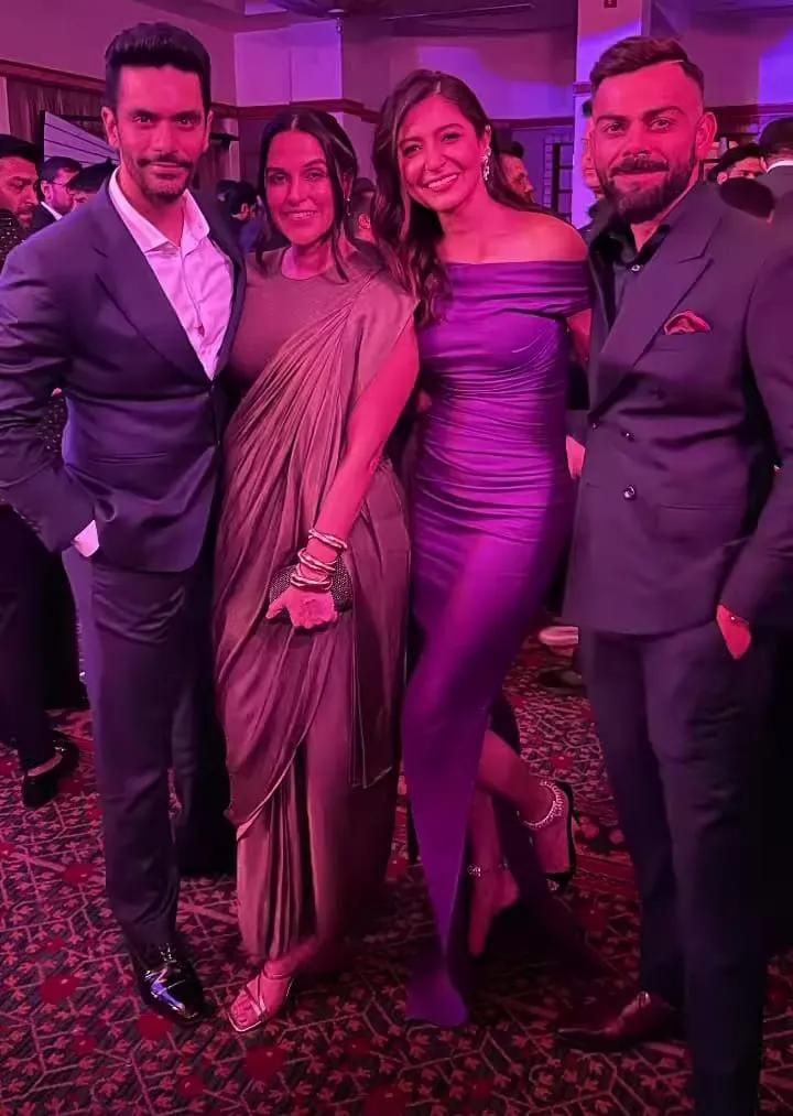 शाम को अनुष्का गहरे बैंगनी रंग की स्लिट्स वाली बॉडीकॉन ड्रेस में थीं, जबकि विराट सूट में हैंडसम लग रहे थे। अंगद ने सूट पहना था और नेहा ने सांवली ग्रे एसिमेट्रिकल साड़ी पहनी थी। दोनों कपल ने शाम के समय एक प्यारी सी तस्वीर खिंचवाई जो वायरल भी हो रही है।